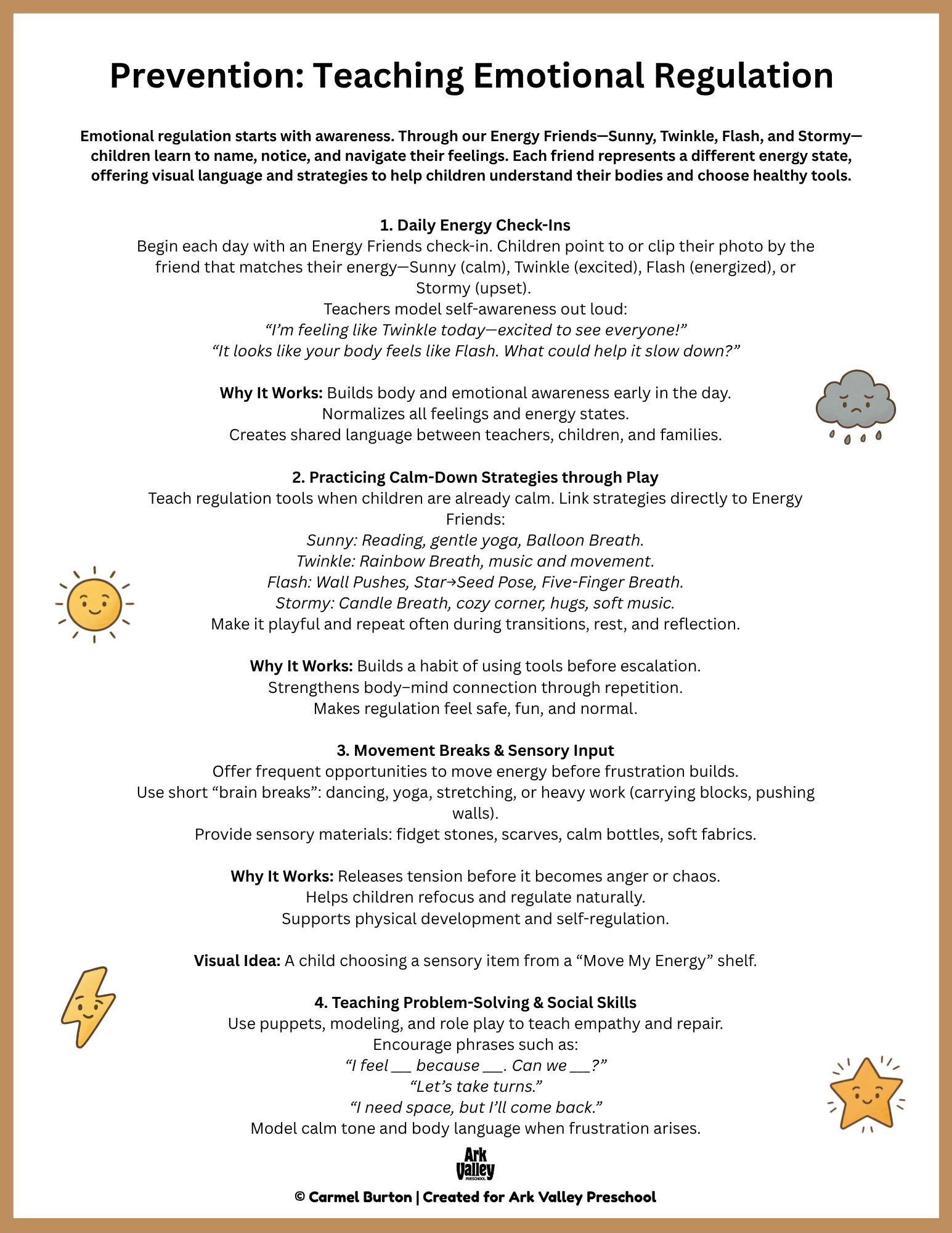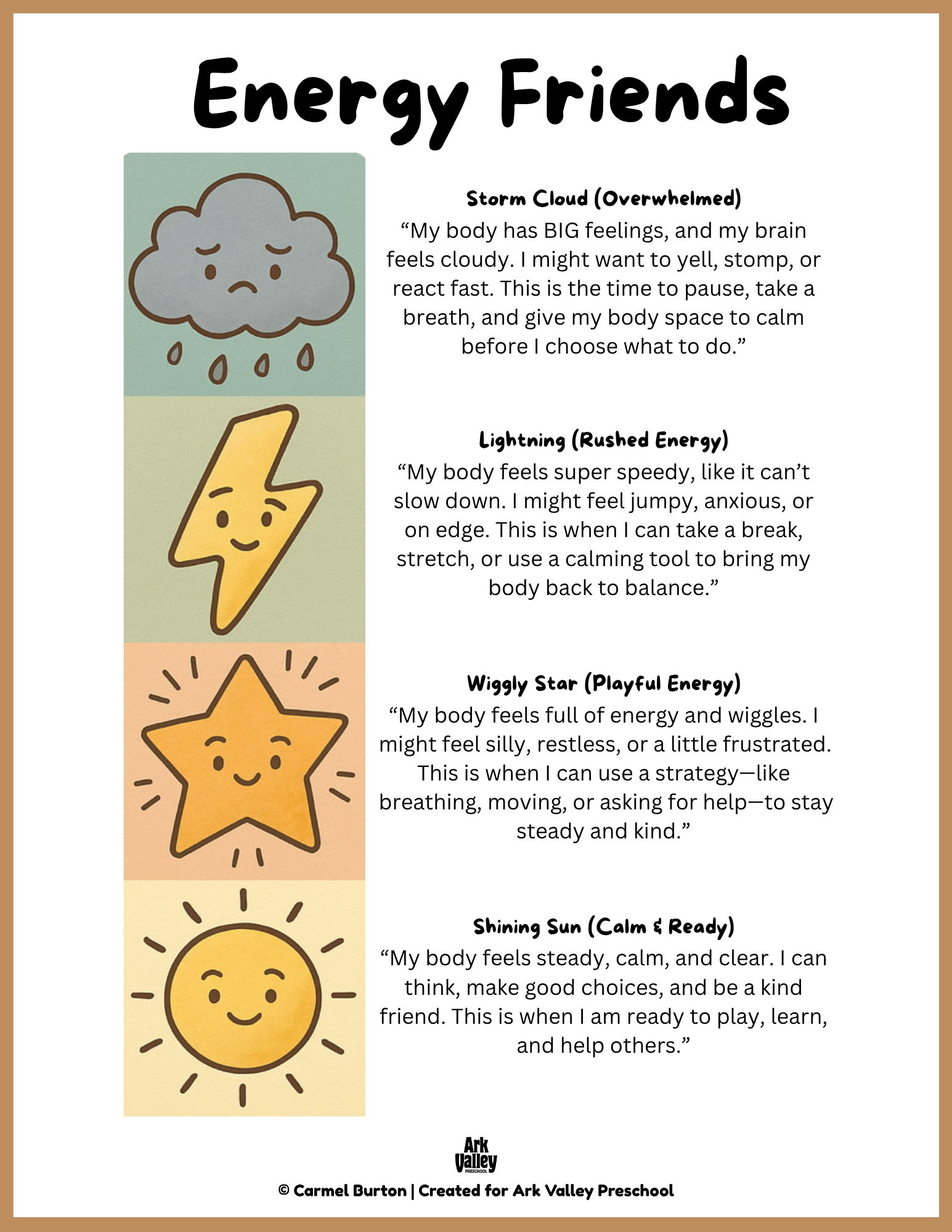 We use the Energy Friends to help children name, notice, and navigate their feelings and energy levels. Each friend represents a different state of energy—from stormy and overwhelmed to calm and ready. These visuals give children the words and tools they need to recognize what’s happening in their bodies and choose healthy strategies.